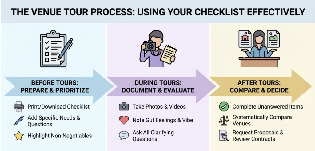 This guide is organized into eight critical categories: capacity and space, pricing and contracts, catering and beverages, logistics and amenities, vendor policies, timeline and availability, design and atmosphere, and contingency planning. By the end, you’ll have a complete framework for evaluating every venue you tour.